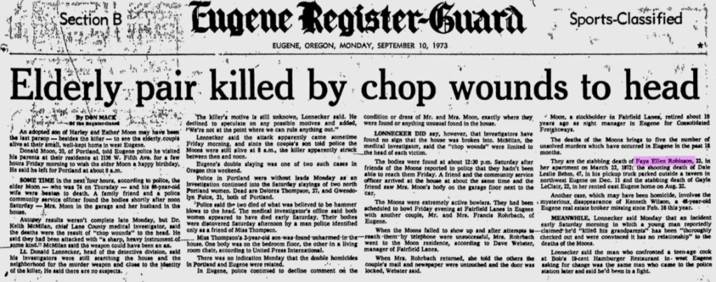 According to an article published in The Oregonian on February 22, 1989, investigators in Oregon were looking into murders that Bundy could have been linked to far before 1972: a student at the University of Oregon, Janet Lynn Shanahan was married and worked PT at a credit union when her remains were found stuffed in the trunk of her car on April 23, 1969. Her vehicle and remains were found in West Eugene by her husband, who reported her missing two days before her body was recovered; according to the medical examiner, she had been raped and strangled. On May 24, 1971 thirty-four Barbara Katherine Cunningham was found deceased in her West Eighth Ave apartment; she had also been raped and strangled.