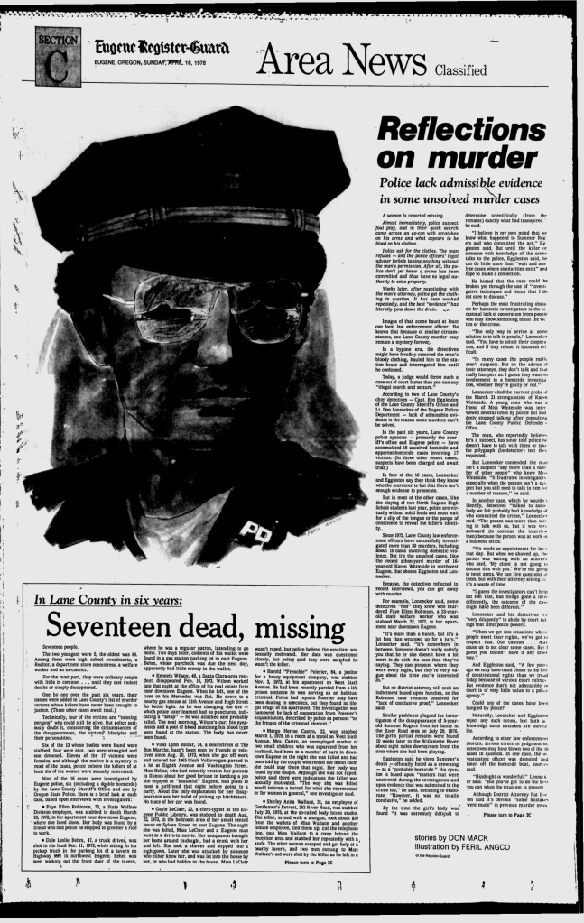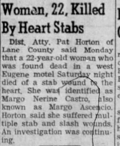 According to an article published by The Sunday Oregonian on December 7, 1975, in March 1974 the remains of seventeen year old Caroletta Spencer were discovered on a road in Sauvie Island; she suffered from multiple gunshot wounds. On the evening of March 1, 1975 the remains of twenty-two year old Margo Nerine Ascencio/Castro were found in a room at the El Don Motel on West 6th Avenue. She had been brutally attacked and died as the result of multiple stab wounds, which she had all over her body. Detectives quickly learned that at one time Ascencio had ties to the Hessian Motorcycle Club, and her murder remains unsolved. Cecelia Louise Hostetler* was twenty seven when she was reported missing out of Eugene in 1975 (even though local LE could find no record of her in their files), and was last seen leaving her POE. It’s speculated that she had plans to hitchhike home using the I-5 and her remains have never been recovered.