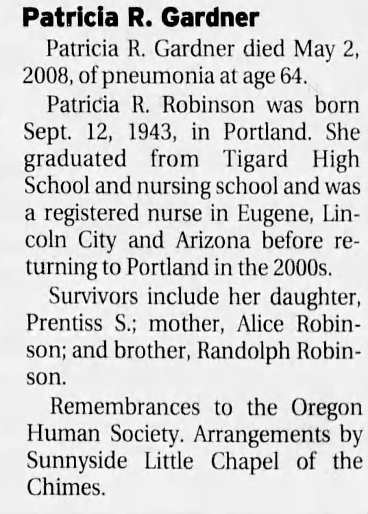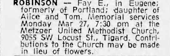 This is Fay’s sophomore year photo from the 1964 Tigard High School yearbook (it looks like they don’t do individual pictures aside from the senior class).Fay in a group picture from Ski Club taken from the 1964 Tigard High School yearbook.Fay in the a picture for Mother’s Tea in the 1964 Tigard High School yearbook.Fay in a group photo from the play ‘Once Upon a Midnight’ taken from the 1964 Tigard High School yearbook.Fay in a group picture for Spanish Club taken from the 1964 Tigard High School yearbook.Fay in the NHS in the 1964 Tigard High School yearbook.Fay’s senior picture from the 1966 Tigard High School yearbook.Fay in a group photo for Ski Club from the 1966 Tigard High School yearbook.Fay in a group photo for IRL Club from the 1966 Tigard High School yearbook.Fay in a group photo for the Tigrettes from the 1966 Tigard High School yearbook.Fay in a group picture for the Tigrettes taken from the 1966 Tigard High School yearbook.Fay in a picture for the Tigrettes from the 1966 Tigard High School yearbook.Fay in a group picture for NHS taken from the 1966 Tigard High School yearbook.Fay Ell Robinson in the Death Index for Oregon, 1898-2008.An article about the murder of Fay Ellen Robinson published in The Eugene Register-Guard on March 22, 1972.An article about the murder of Fay Ellen Robinson published in The Oregon Daily Journal on March 23, 1972.An article about the murder of Fay Ellen Robinson published in The Capital Journal on March 23, 1972.An article about the murder of Fay Ellen Robinson published in The Eugene Register-Guard on March 23, 1972.An article about the murder of Fay Ellen Robinson published in The Eugene Register-Guard on March 22, 1972.An article about the murder of Fay Ellen Robinson published in The Statesman Journal on March 23, 1972.An article about the murder of Fay Ellen Robinson published in The Albany Democrat-Herald on March 23, 1972.Fay Ellen Robinson’s obituary published in The Oregonian on March 25, 1972.An article about a Eugene woman that killed her husband that mentions the murder of Fay Ellen Robinson published in The Eugene Register-Guard Apr 4, 1972.An article about the murder of Fay Ellen Robinson published in The Eugene Register-Guard on September 10, 1973.An article about unsolved murders in Lane County that mentions Fay Ellen Robinson published in The Eugene Register-Guard on April 16, 1978.The first part of an article mentioning Robinson’s murder published in The Eugene Register-Guard on April 16, 1978.The second part of an article mentioning Robinson’s murder published in The Eugene Register-Guard on April 16, 1978.An article about Bundy’s possible Oregon victims that mentions Fay Robinson published in barbThomas, Alice, and Fay’s gravestone, which is located in Cor 201, Niche 200 at the River View Cemetery in Portland, OR.Fay’s mother’s birth certificate. Fay’s parent’s wedding announcement published in The Corvallis Gazette-Times on August 9, 1938.Mr. and Mrs. Robinson’s record of marriage.Thomas H. Robinson’s WWII draft card.Fay and the rest of her family listed in the 1950 US census.Patricia Robinsons senior picture from the 1961 Tigard High School yearbook.A picture of Randy Robinson from the 1964 Tigard High School yearbook.Mr. Robinson’s obituary, published in The Sun on February 21, 2003.Patricia Robinson-Gardner’s obituary published in The Sunday Oregonian on May 11, 2008.Teds whereabouts in early 1972 according to the ‘1992 TB FBI Multiagency Report.’ Rita Lorraine Jolly, who disappeared out of her West Linn neighborhood at 7:15 PM on June 29, 1973 after leaving to go for a walk.Justis was last heard from on November 5, 1973 after she called her mother from outside the Memorial Coliseum in Portland, OR.Vicki Lynn Hollar, who disappeared from Eugene, OR on August 20, 1973. Alma Jean Barra, who was last seen leaving the Copper Penny Tavern in Portland between 11 and 11:30 PM on March 23, 1972A newspaper article about the strangulation death of Janet Lynn Shanahan published in The Oregon Daily Journal on April 24, 1969.A newspaper article about the strangulation death of Barbara Katherine Cunningham published in The Oregon Daily Journal on May 27, 1971.Gayle Elizabeth LeClair, who was found deceased in her Eugene apartment on August 23, 1972.The gravestone of Geneva Joy Martin, who was found deceased on the side of the road in Eugene by a local farmer in July 1972. A newspaper article about the death of Laurie Canaday published in The Oregon Journal on July 9, 1973.A newspaper article about the strangulation death of Alison Caufman published in The Sunday Oregonian on June 24, 1973.Deborah Lee Tomlinson disappeared out of Creswell, OR with an unidentified girlfriend on her sixteenth birthday on October 15, 1973.Virginia Erickson, a resident of Sweet Home, OR that has been missing since October 21, 1973. An article about Floy Joy ‘Jeanne’ Bennet published in The Bulletin on March 2, 1988.An article about the homicide of Margo Nerine Castro published in The Greater Oregon on March 7, 1975.