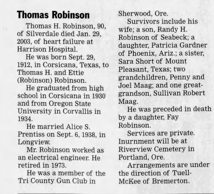 Fay’s sister Patricia died from pneumonia at the age of 64 on May 2, 2008 in Beaverton, WA.Thomas Robinson passed away from heart failure on February 21, 2003 in Silverdale, Washington. He retired from an eventful career as an electrical engineer in 1973 and was a member of the Tri County Gun Club in Sherwood, Oregon. Mrs. Robinson died at the age of 93 on January 31, 2010 in Bremerton, WA.As of December 2024 the murder of Fay Ellen Robinson remains unsolved.