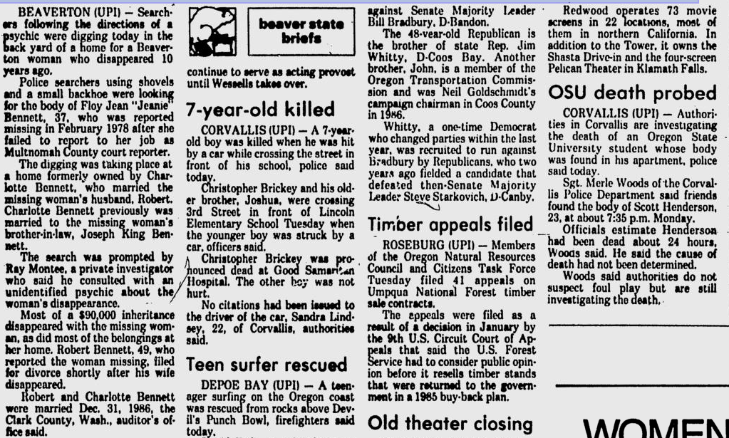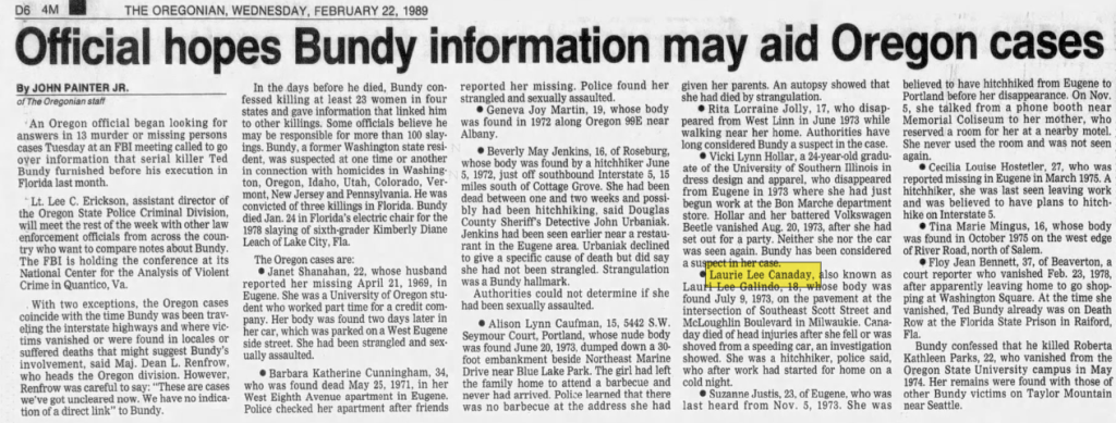 I didn’t know Bundy was ever actually suspected in any additional Oregon murders on top of Roberta Parks (for sure) and (possibly) Vicki Hollar/Rita Jolly/Sue Justis, but according to an article published by The Eugene Register-Guard on February 24, 1989, Martin was at one time considered a possible victim of his as well as Beverly May Jenkins, Allison Lynn Caufman, Laurie Lee Canaday, Tina Marie Mingus, and Floy Jean Bennet. Now, I am in no way saying these women are really possible victims of Ted Bundy, I’m just saying they were in the very least in the correct place at the right (or wrong) time (well sort of, as some if the dates are completely off). Sixteen year old Beverly May Jenkins was from Roseburg, OR and in June 1972 her remains were found just off the I-5 roughly ten miles outside of Cottage Grove; she had been strangled to death. Fifteen year old Portland native Allison Lynn Caufman died as a result of head injuries after being shoved from a car moving at a high rate of speed in July 1973. I think the last two girls can be quickly debunked, as Bundy was in prison when both victims were killed. Tina Marie Mingus was only 16 years old when her body was found in Salem, OR in October 1975, and Flow Joy Bennet was 37 (and obviously a bit out of Bundy’s preferred age range) when she vanished in February 1978. What’s strange is I couldn’t find any more information about any of these women out there. It’s almost as if they never existed.